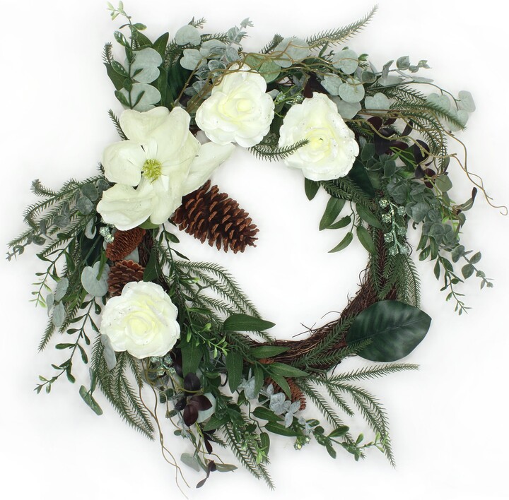 National Tree Company 26 in. Mixed Greens and White Flowers Decorated Wreath