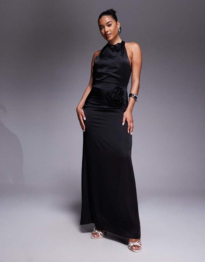 Jarlo satin halterneck open back corsage detailing maxi dress in black