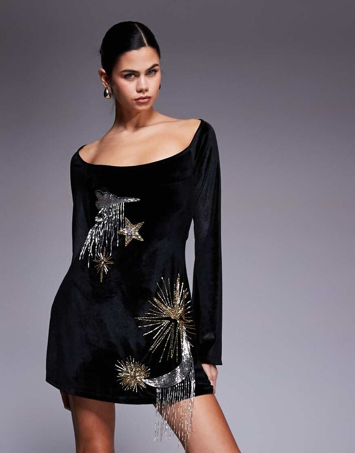 ASOS DESIGN super scoop neck long sleeve mini dress with a-line skirt and celestial embellishments in bonded velvet