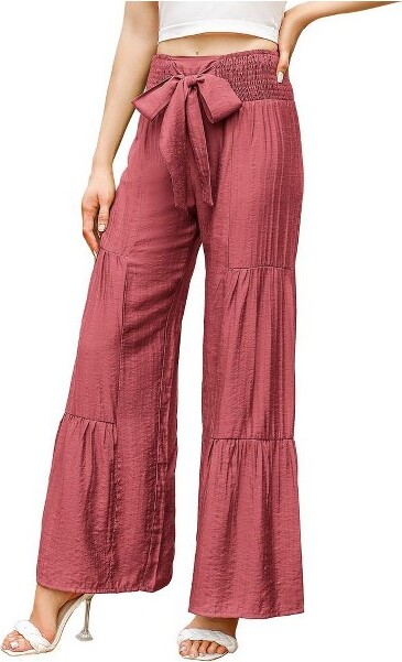WhizMaxWomen'sWideLegHighWaistPantsSmockedElasticWaistLooseFlowyPantWithBeltRed-brownXL