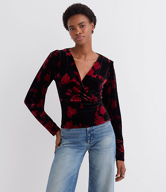 LOFT Petite Floral Velvet Puff Sleeve V-Neck Top