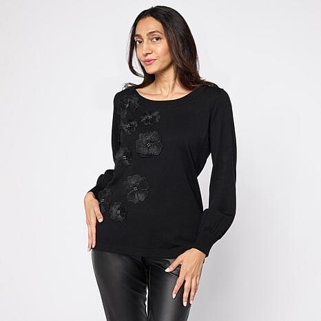 Nina Leonard Long Balloon Sleeve Round Neck Sweater Top - Black - Size X-Small