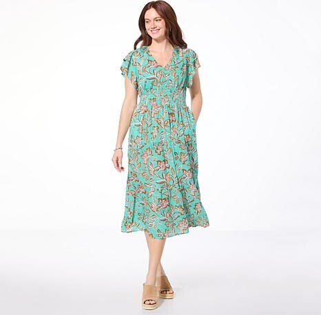 Democracy Smocked Waist Flutter Sleeve Midi Dress - Marine Green Multi - Size 2X