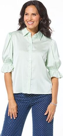 G by Giuliana Stretch Satin Flounce-Sleeve Button-Up Blouse - Green - Size X-Large